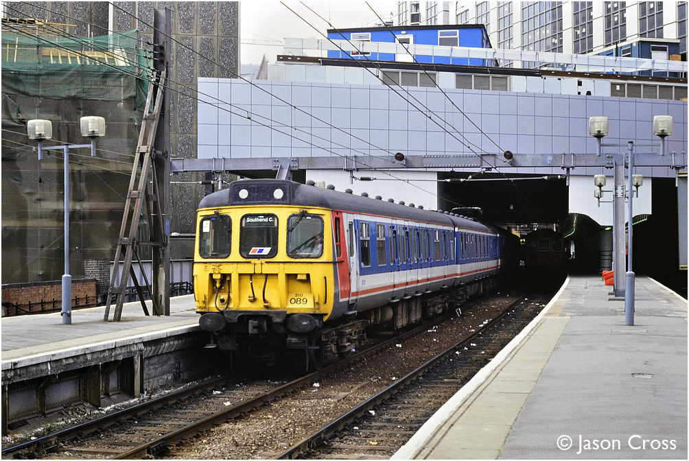 310089 departs from Fenchurch Street with a service for Southend Central.