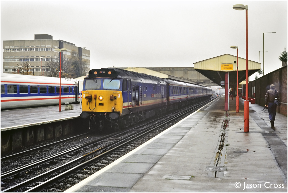 In the pouring rain, 50033 calls at Woking with the 2O82 0645 Exeter St Davids to London Waterloo. Date: 17 November 1990