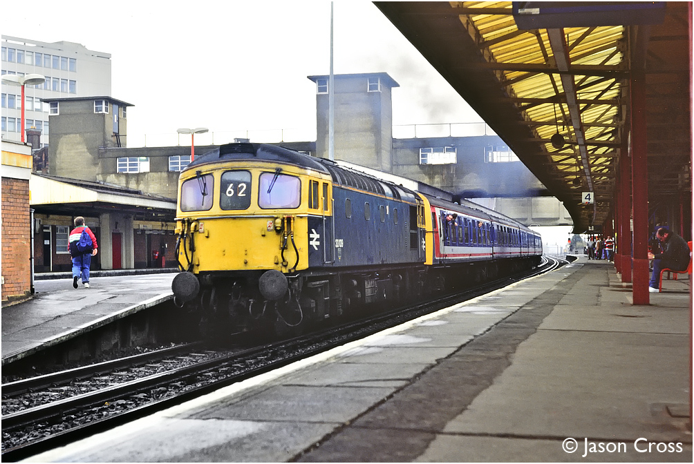 33109 gives it a handful as it leaves Woking with the 1L09 1215 Waterloo to Salisbury. Date: 17 November 1990