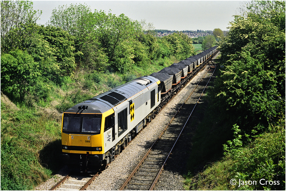 60089 on the rear of an Asfordby Mine to Rufford Coal Stocking site MGR train as it makes its way down towards Melton Junction. Date: 15 May 1992