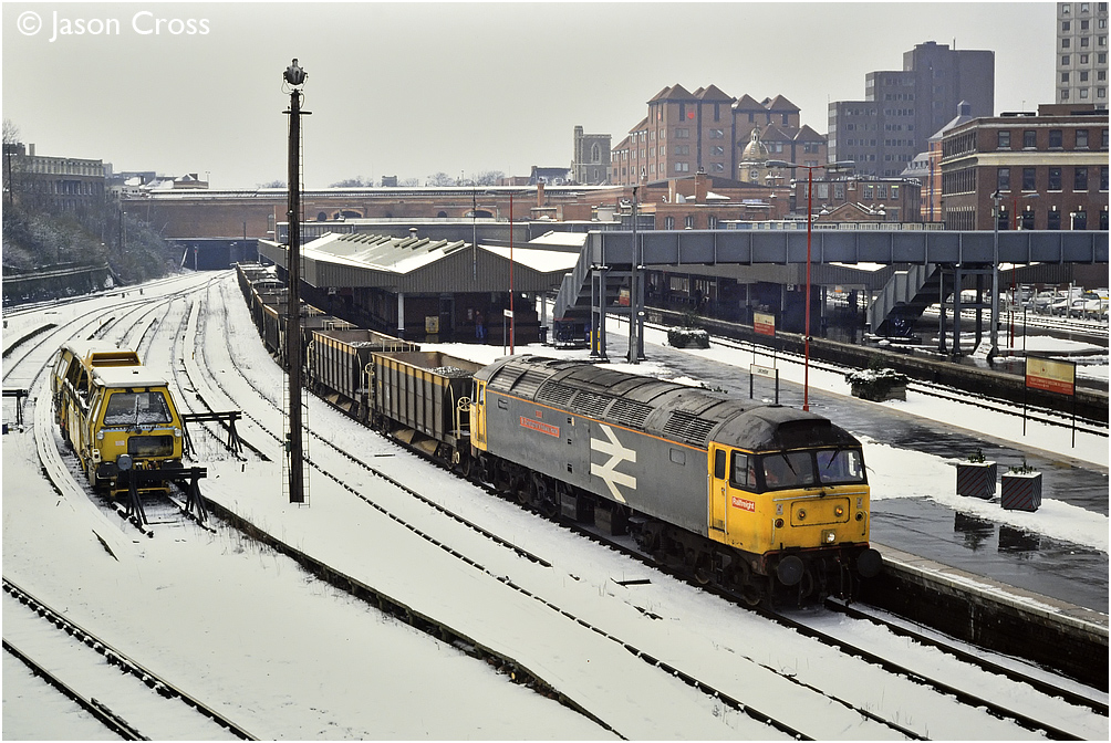 47348 departs from Leicester having just run round a Sandiacre to Mountsorrel empty ballast train in platform 4. Date: 15 February 1994