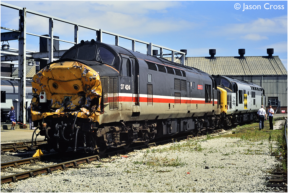 A crash damaged 37424 has 37699 for company in Doncaster Works during the 1994 open day. Date: 10 July 1994
