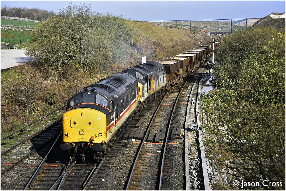 37426 and 37026 arrive at Great Rocks Junction with a train of empty limestone hoppers from Northwich. Date: 14 April 1995