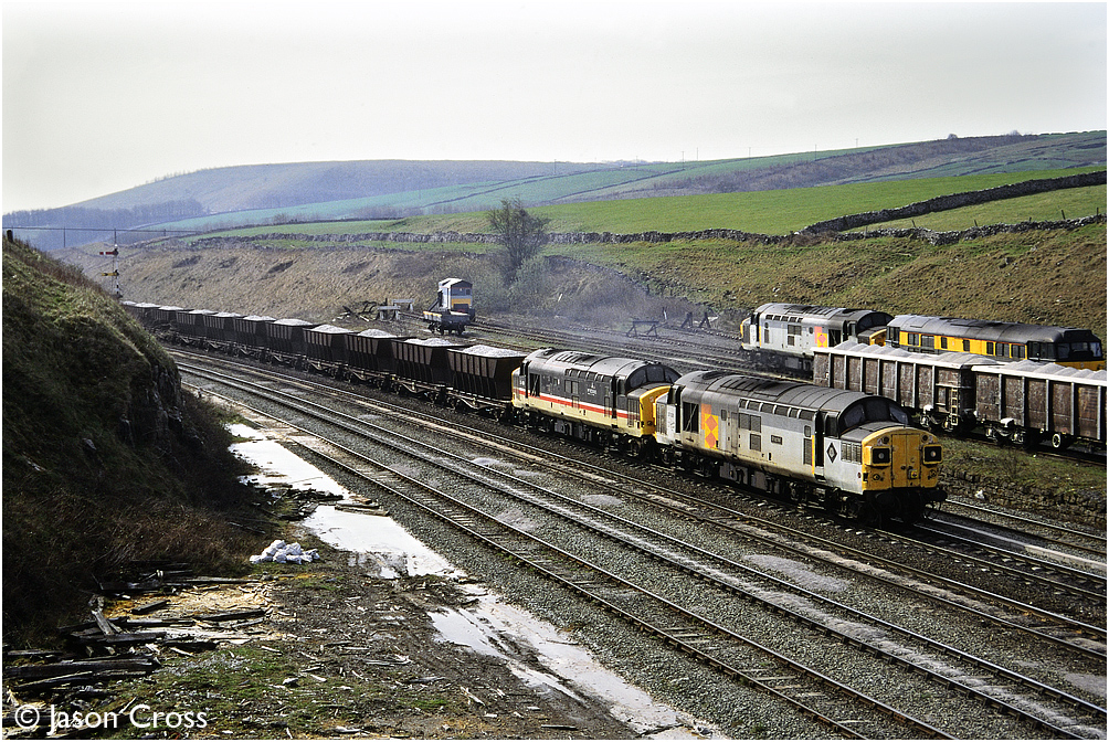 37026 and 37426 climb through Peak Forest with a Tunstead to Northwich limestone train. Date: 14 April 1995