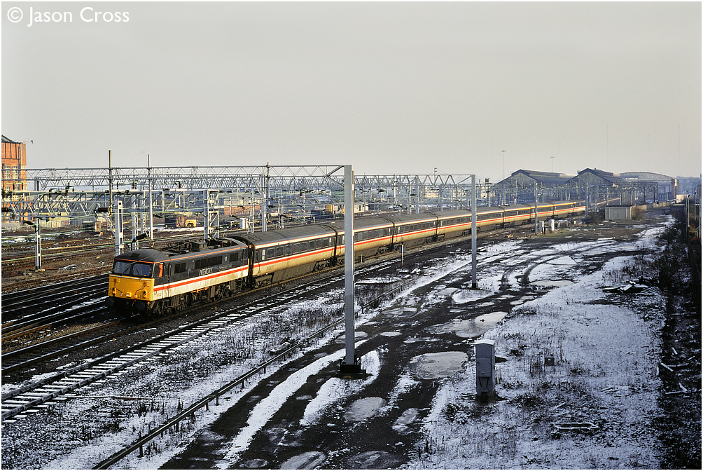 With a sprinkling of snow and a sharp frost apparent, 87012 passes through Rugby with a northbound Inter City service. Date: 10 December 1995
