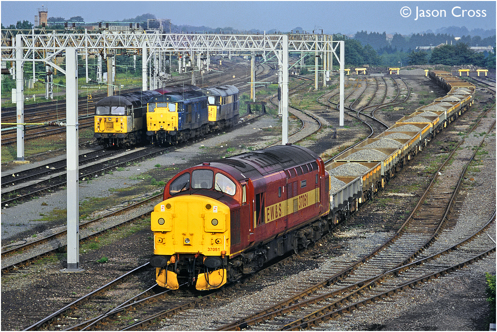 37051 crawls out of Rugby Yard with a rake of ballast wagons.