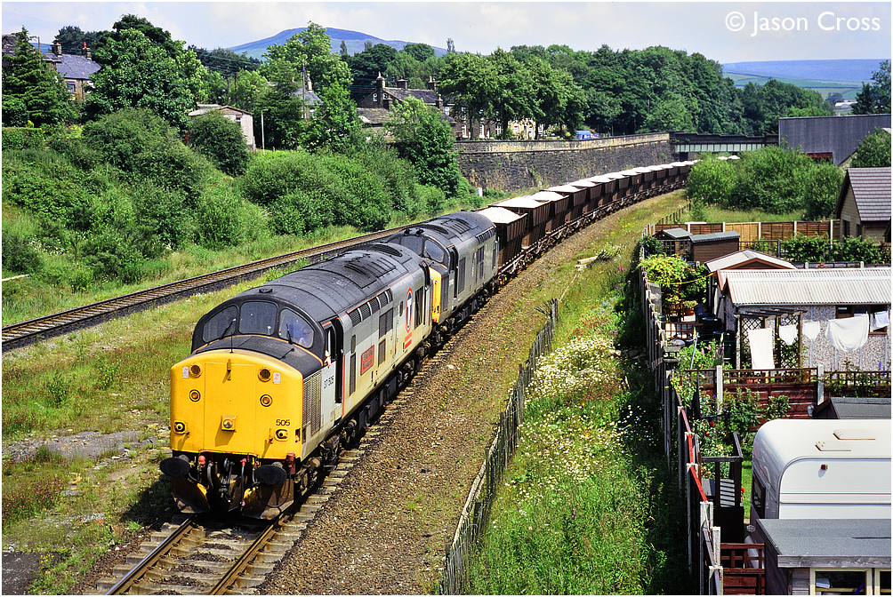 37505 and 37162 pass Chinley with the 7F45 1327 Tunstead to Northwich limestone hoppers. Date: 8 July 1997