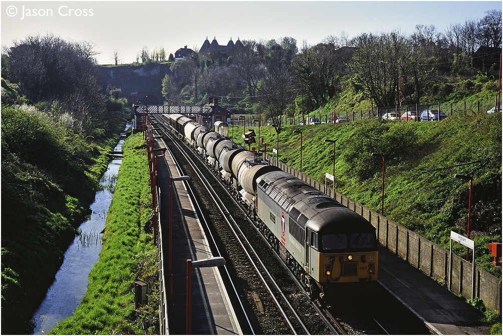 56093 passes through Higham station with a Sittingbourne to Hoo Junction trip freight. Date: 4 April 1997