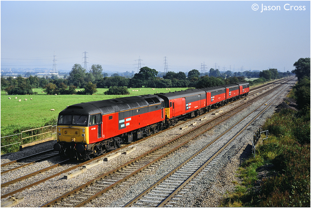 47596 passes Coedkernew with the 5M06 1025 Bristol Temple Meads to Swansea empty mail vans. Date: 18 September 1997