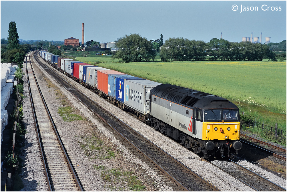 47337 approaches Burton on Trent at Wetmore Farm with the 4O31 Leeds to Southampton container train. Date: 31 May 1997