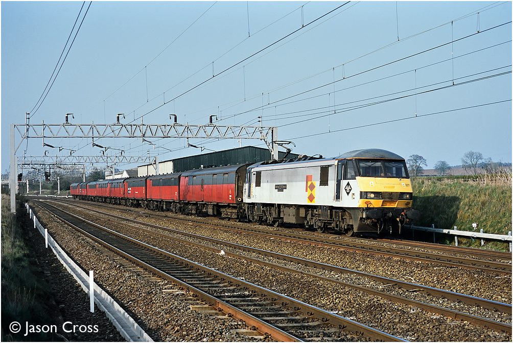 90227 passes Shallowford at the head of the 1A90 1532 Warrington RMT to Willesden Railnet mail train. Date: 29 March 2002