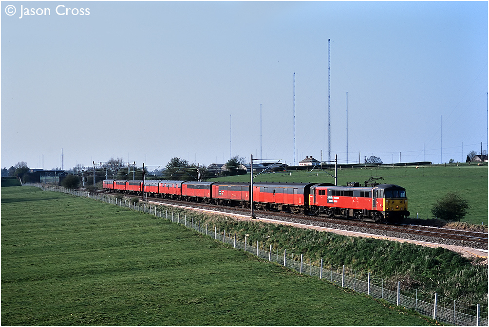 86243 passes Barby Nortoft at the head of the 1A90 1532 Warrington RMT to Willesden Railnet mail train. Date: 5 April 2002