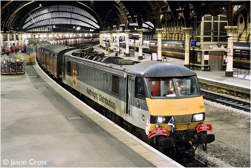 The last night of the Travelling Post Office (TPO), 90033 pauses at York with 1E53 2312 Willesden to Low Fell. Date: 10 January 2004