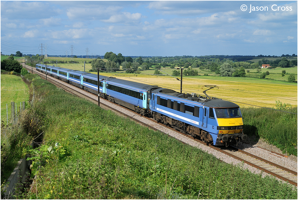 90007 passes Dunston with the 1700 Norwich to London Liverpool Street service. Date: 28 June 2008 Manipulation Notes: None