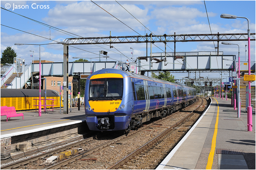 357225 departs from Upminster with a Fenchurch Street to Shoeburyness service. On the left is London Underground battery loco L16. Date: 29 August 2009 Manipulation Notes: None