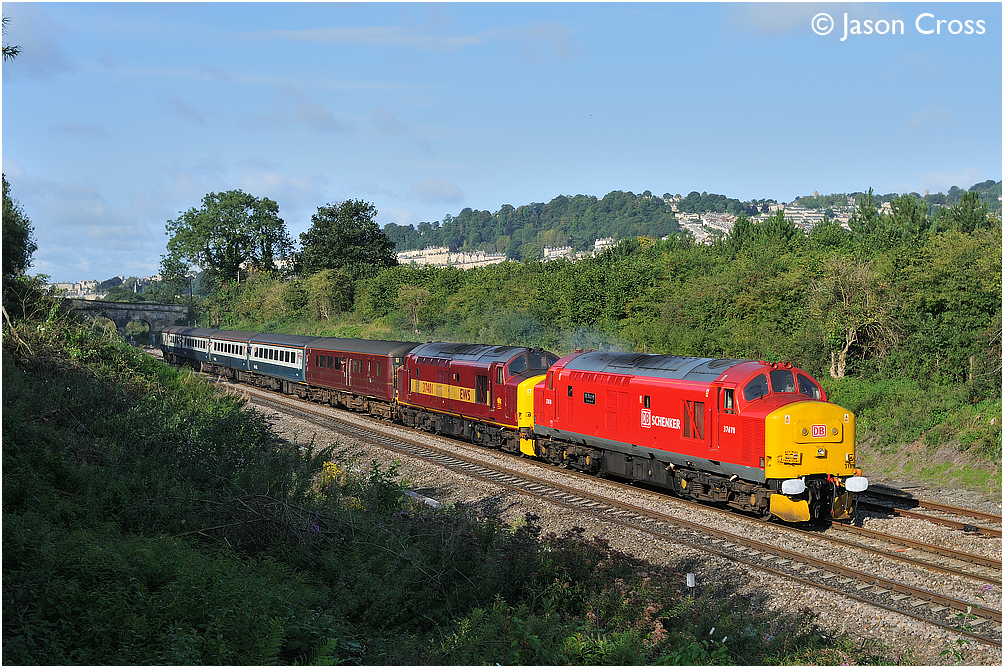 37670 and 37401 power the 2O72 0909 Bristol Temple Meads to Weymouth at Bathampton. Date: 5 September 2009 Manipulation Notes: None