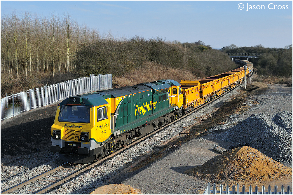70005 climbs Bagworth bank with a 6Z21 1116 Crewe Basford Hall to Stud Farm working. Date: 16 March 2010 Manipulation Notes: None