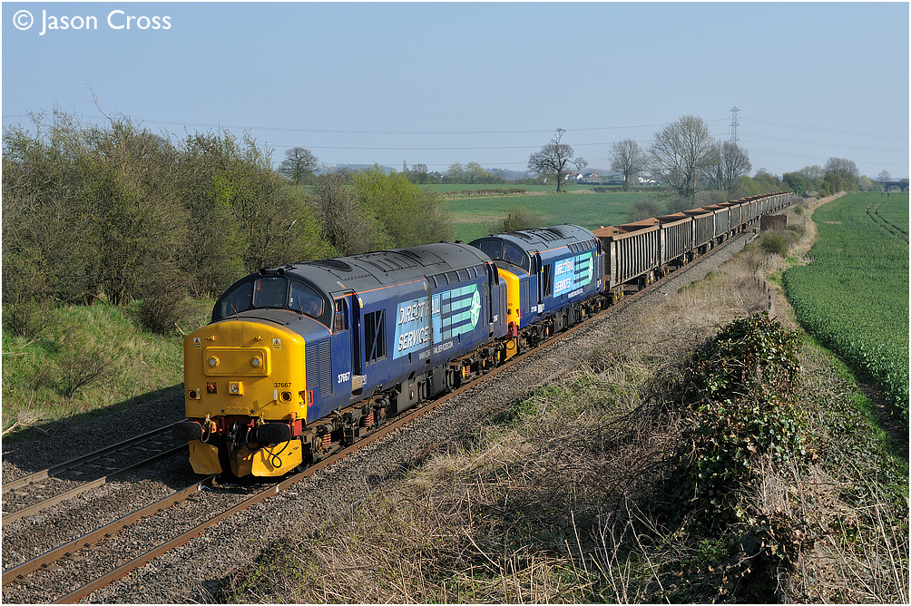 37667 and 37510 head north at Elford in charge of a 6Z70 1008 Sheerness to Tyne Dock train of scrap metal empties. Date: 17 April 2010 Manipulation Notes: None