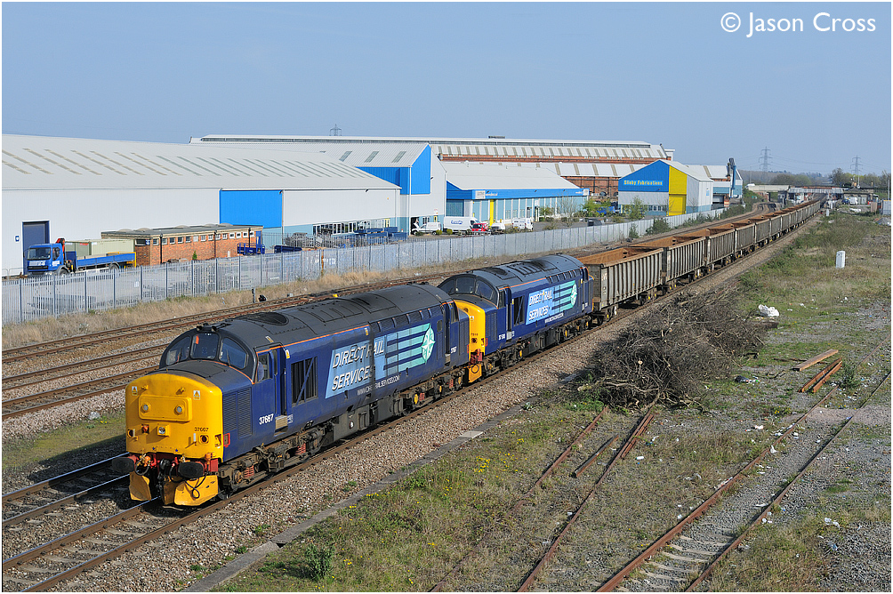 37667 and 37510 pass Loughborough with a 6Z70 1014 Sheerness to Stockton train of scrap empties. Date: 21 April 2010 Manipulation Notes: None