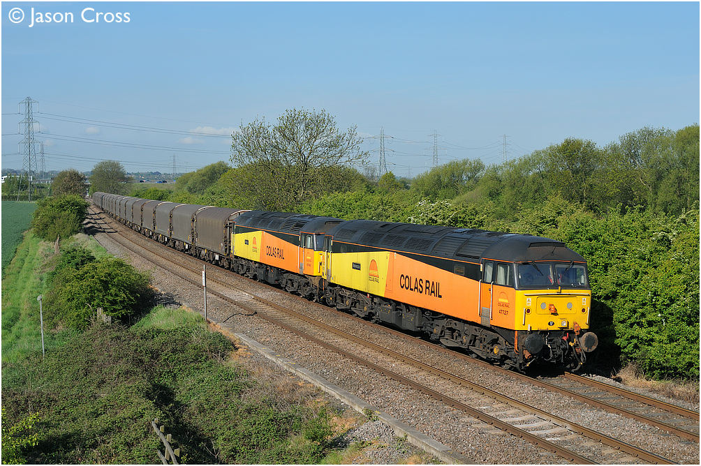 47727 and 47749 at Lockington with a 6Z56 0602 Washwood Heath to Boston Docks train of steel empties. Date: 13 May 2010 Manipulation Notes: None