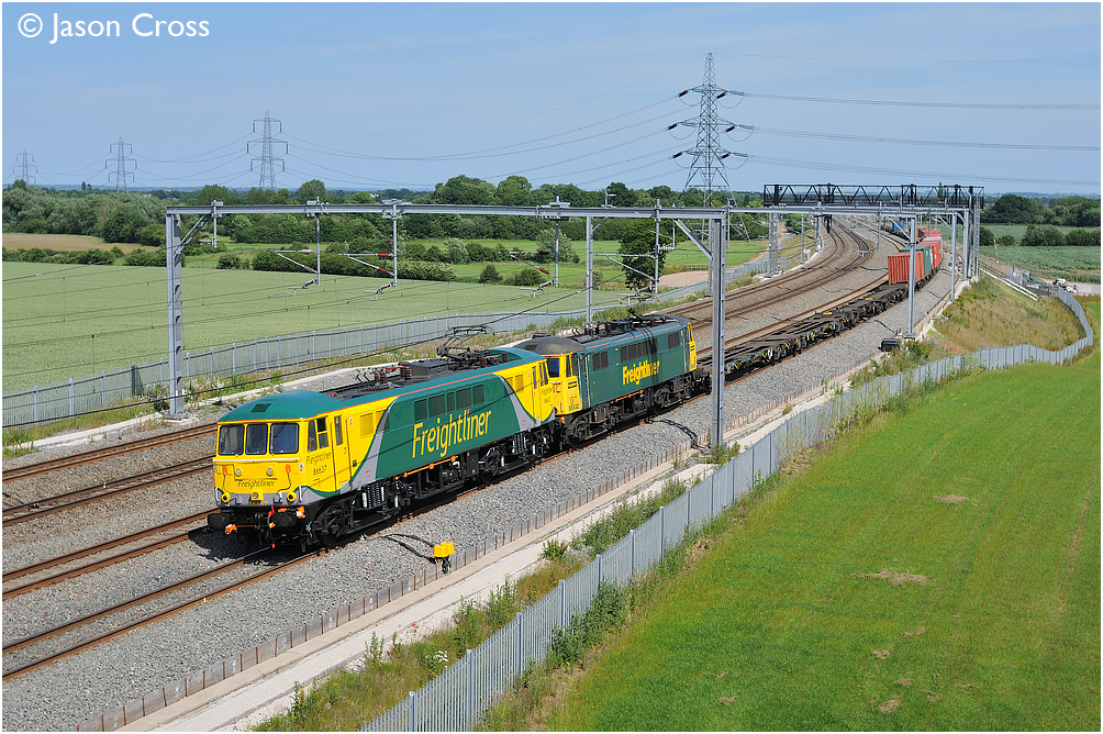 Ex works in the then new 'Powerhaul' livery, 86637 partners 86632 on the approach to Lichfield at the head of 4M54 1028 Tilbury to Crewe Basford Hall. Date: 23 June 2010 Manipulation Notes: None