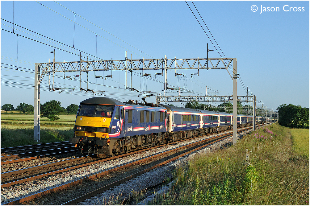 90021 passes Whittington Lane at the head of the 1M16 2046 Inverness to London Euston Caledonian Sleeper. Date: 4 July 2010 Manipulation Notes: None