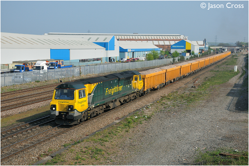 70002 passing Loughborough at the head of a 6C64 1348 Mountsorrel to Carlisle loaded ballast. Date: 20 April 2011 Manipulation Notes: None