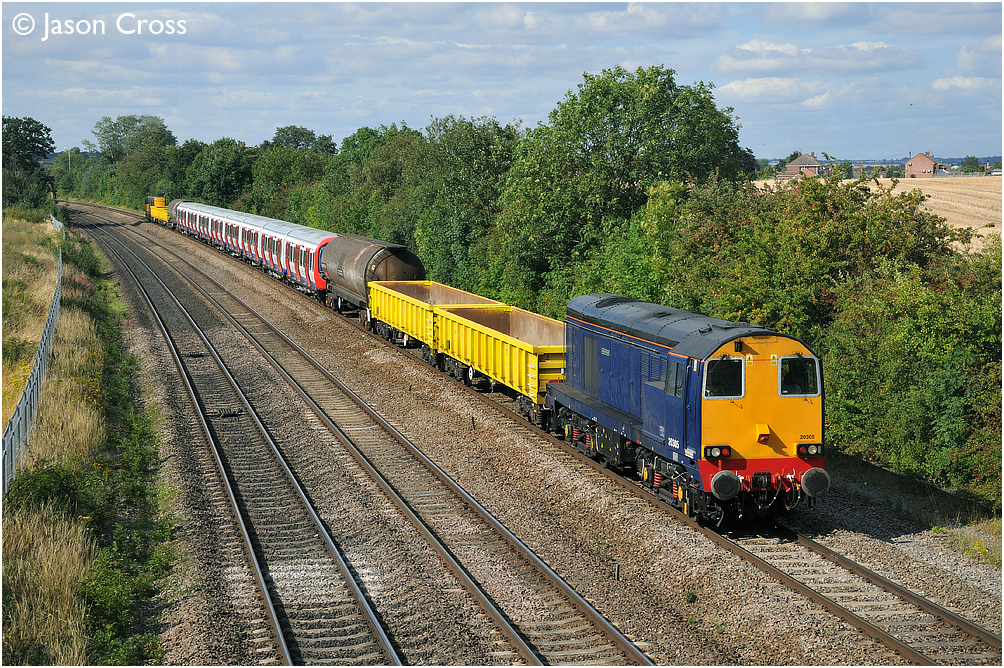 20305 brings up the rear of an 8X23 0933 Derby Litchurch Lane to Asfordby Test Centre S-stock move. 20301 is leading the train and the S stock set being moved is 21051-21052. Date: 9 August 2011 Manipulation Notes: None
