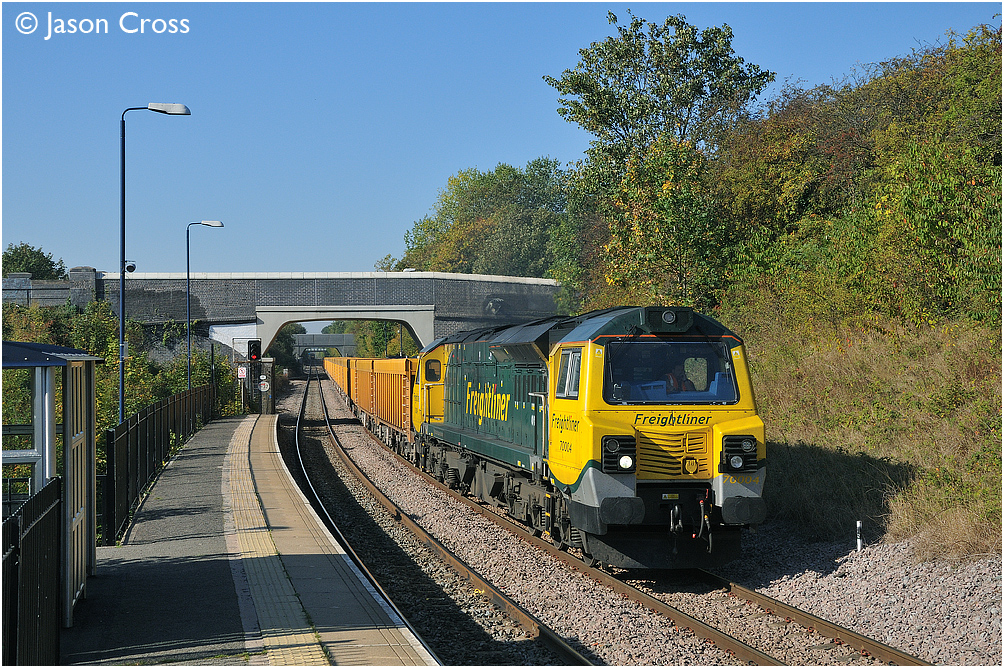 70004 hauls a 6D66 0847 Bescot Virtual Quarry to Mountsorrel train of ballast empties through South Wigston. Date: 29 September 2011 Manipulation Notes: None