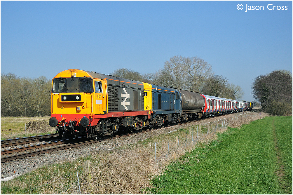20227 and 20142 have S Stock set 21067-068 in tow as they pass East Goscote working 7X09 1142 Asfordby to Neasden Depot. Date: 28 March 2012 Manipulation Notes: None
