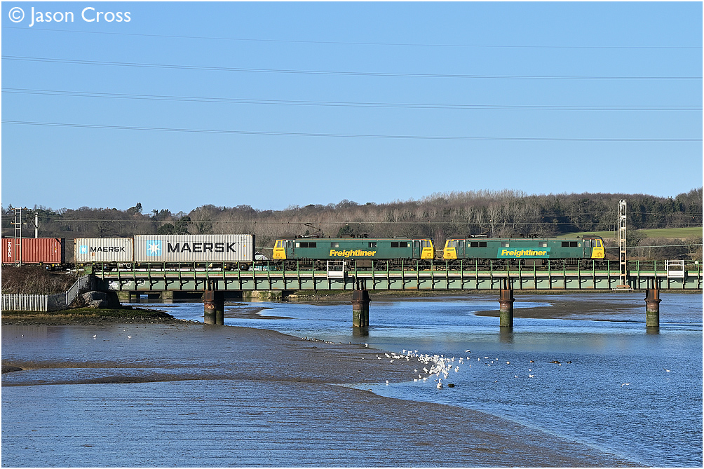 86604 and 86628 cross the River Stour at Cattawade with the 4L97 0457 Trafford Park to Felixstowe North container train. Date: 18 January 2020 Manipulation Notes: None