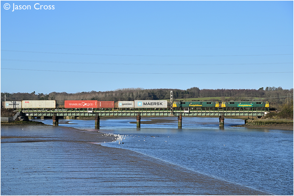 86604 and 86628 cross the River Stour at Cattawade with the 4L97 0457 Trafford Park to Felixstowe North container train. Date: 18 January 2020 Manipulation Notes: None