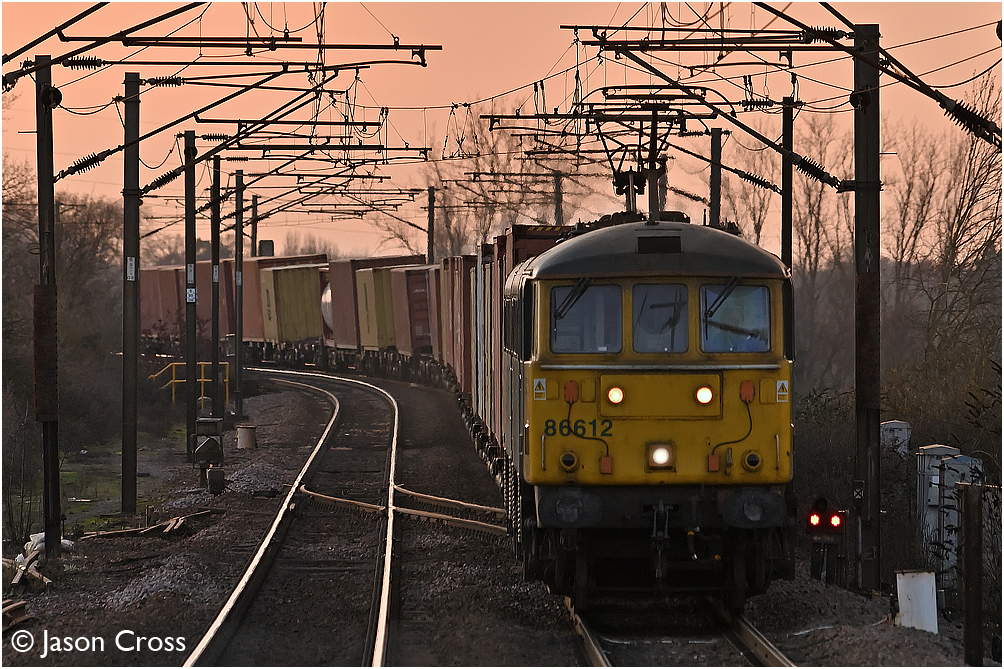 86612 and 86608 bathe in the afterglow just after sunset as they pass through Manningtree at the head of 4L93 0825 Crewe Basford Hall SSMto Felixstowe North Freightliner Terminal. Date: 18 January 2020 Manipulation Notes: None