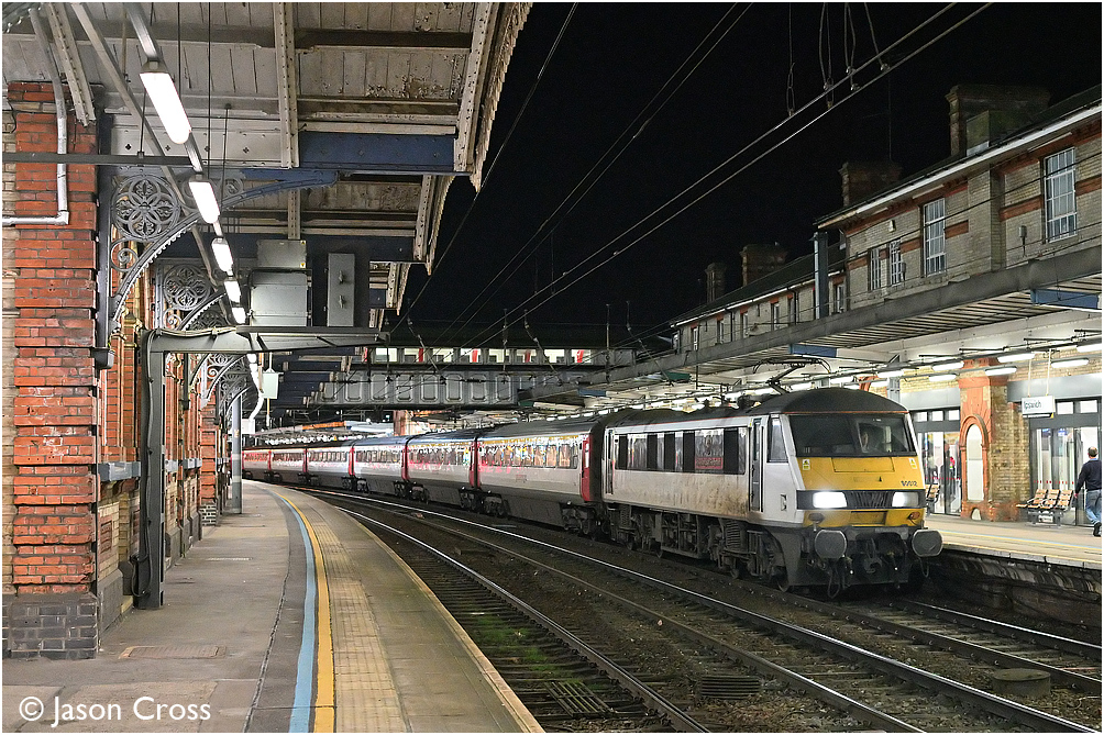 90012 arrives at Ipswich with the 1P55 1704 Norwich to London Liverpool Street. Date: 18 January 2020 Manipulation Notes: None