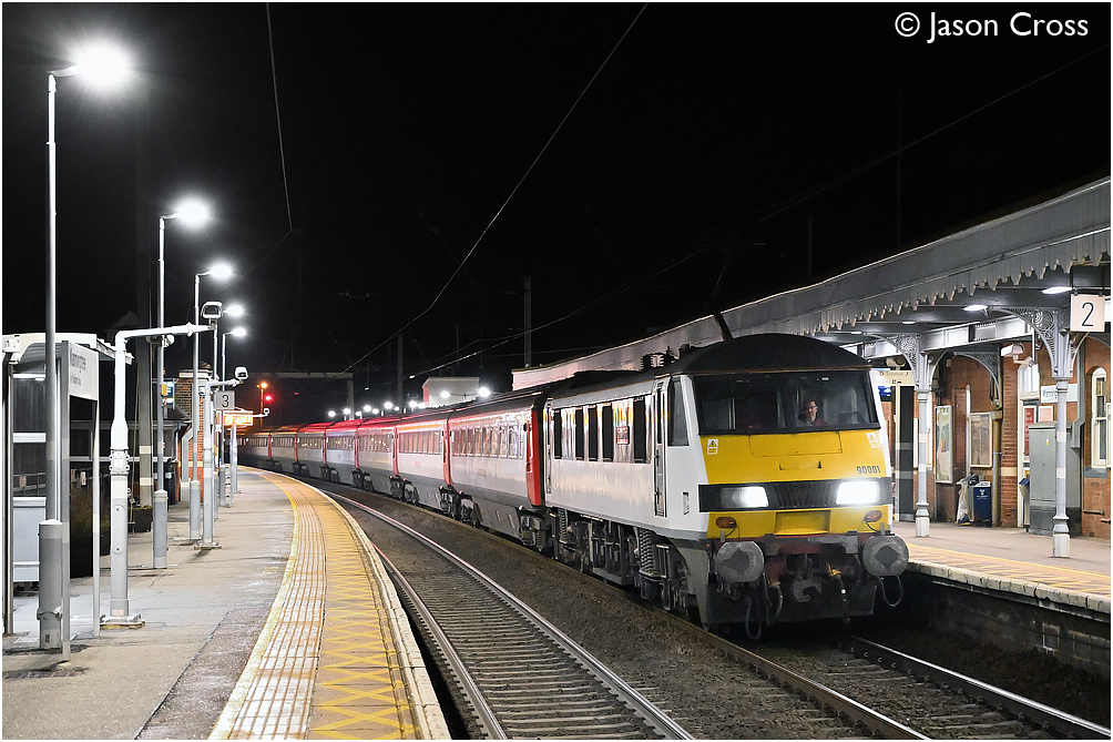 90001 makes the Manningtree stop while working the 1P61 1830 Norwich to London Liverpool Street. Date: 18 January 2020 Manipulation Notes: None
