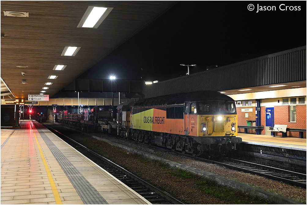 56096 passes through Leicester with a 6C77 Toton to Market Harborough engineering train. Date: 29 January 2020 Manipulation Notes: None