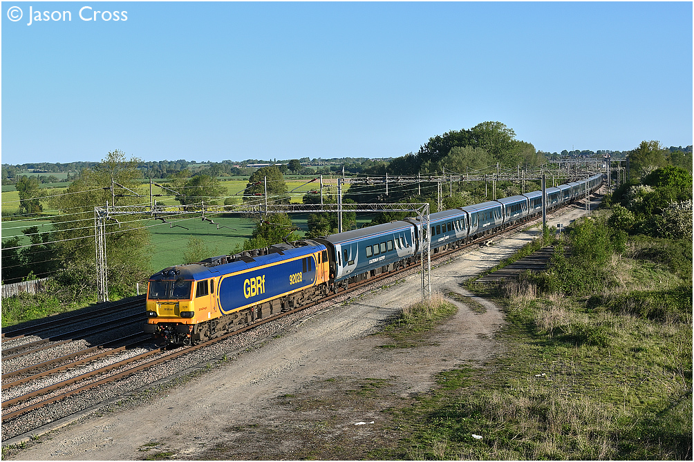 92028 passes Gordon's Lodge near Ashton with the 1M16 2045 Inverness and Glasgow Central to London Euston Caledonian Sleeper. Date: 14 May 2020 Manipulation Notes: None Camera mounted on a tall pole and remotely fired