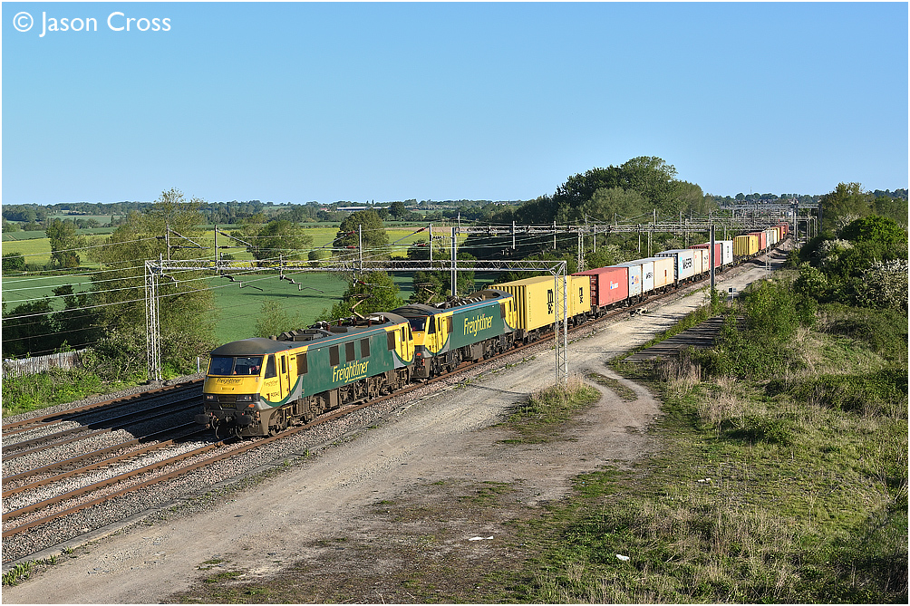 Powerhaul pair 90043 and 90042 pass Gordon's Lodge with a well loaded 4L89 Coatbridge to Felixstowe container train. Date: 14 May 2020 Manipulation Notes: None Camera mounted on a tall pole and remotely fired
