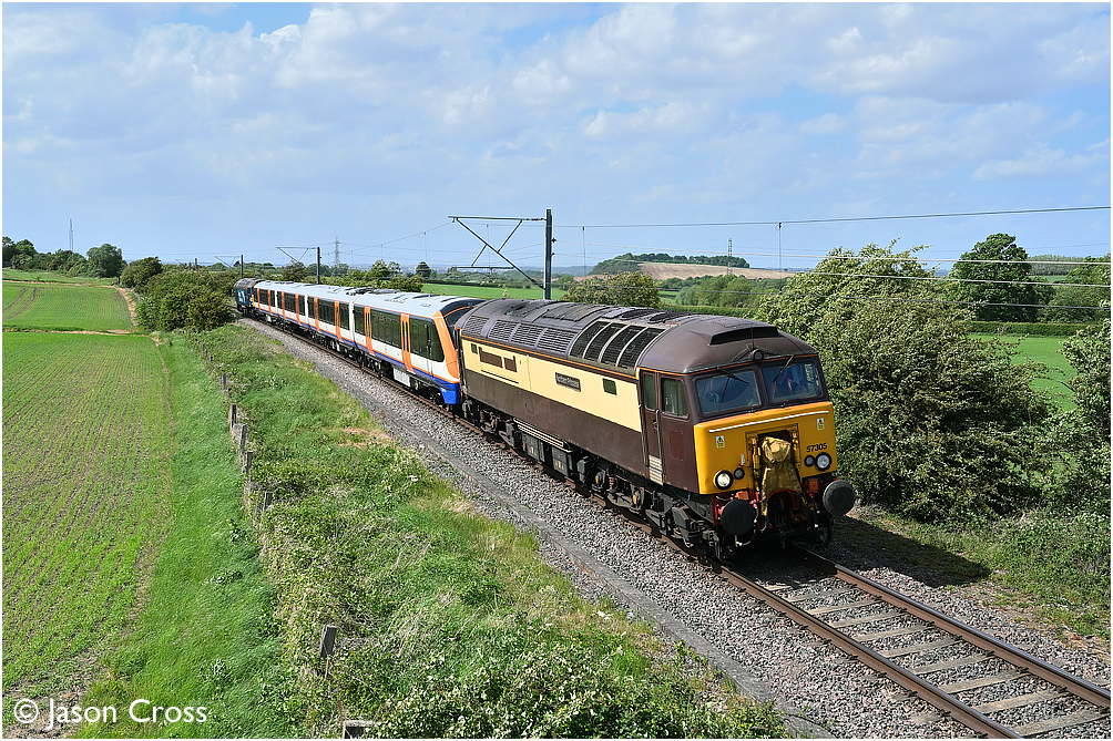 57305 and 57310 top and tail 710111 at Stanton-on-the-Wolds on the Old Dalby test track during brake test runs. Date: 22 May 2020 Manipulation Notes: None Camera mounted on a tall pole and remotely fired
