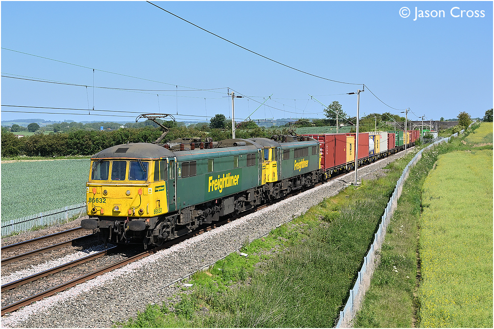 86632 and 86609 at Milton Malsor at the head of the 4L93 0825 Crewe Basford Hall to Felixstowe North container train. Date: 30 May 2020 Manipulation Notes: None Camera mounted on a tall pole and remotely fired
