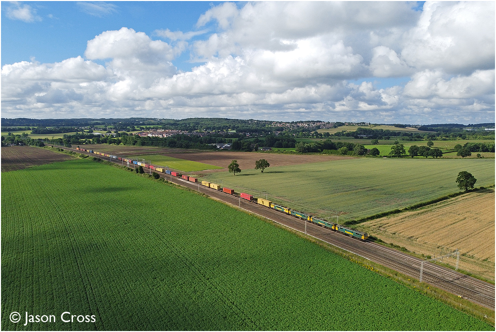 Train locos 86632 and 86614 have 86607 and 86637 dead in tow as they haul 4M45 0257 Felixstowe North to Garston container train at Grendon. Date: 12 July 2020 Manipulation Notes: None Photo taken from a drone