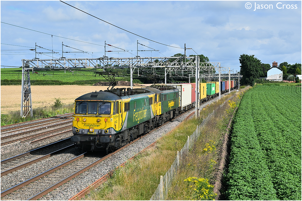 86622 and 86613 pass Grendon with the 4L93 0825 Crewe Basford Hall to Felixstowe North container train. Date: 11 July 2020 Manipulation Notes: None Camera mounted on a tall pole and remotely fired