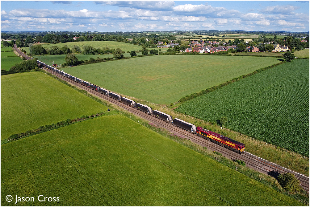 66084 passing Rearsby with the 6M88 1325 Middleton Towers to Arpley Sidings sand train. Date: 12 July 2020 Manipulation Notes: None Photo taken from a drone