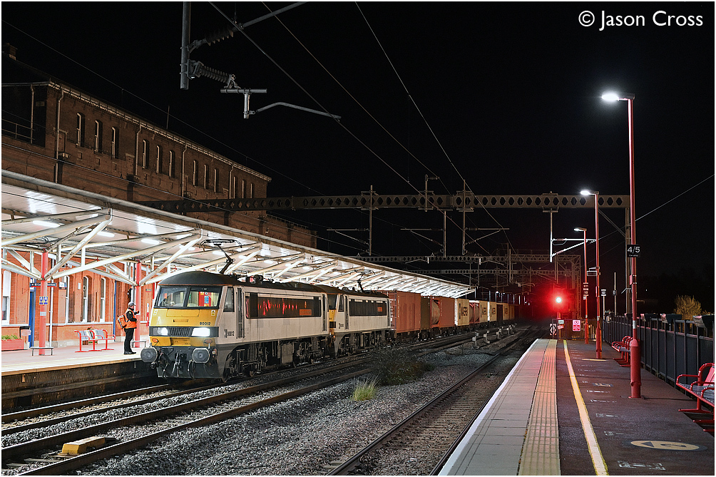 90012 and 90007 pause for a crew change at Rugby with 4S88 Felixstowe to Coatbridge. Date: 18 November 2020 Manipulation Notes: None