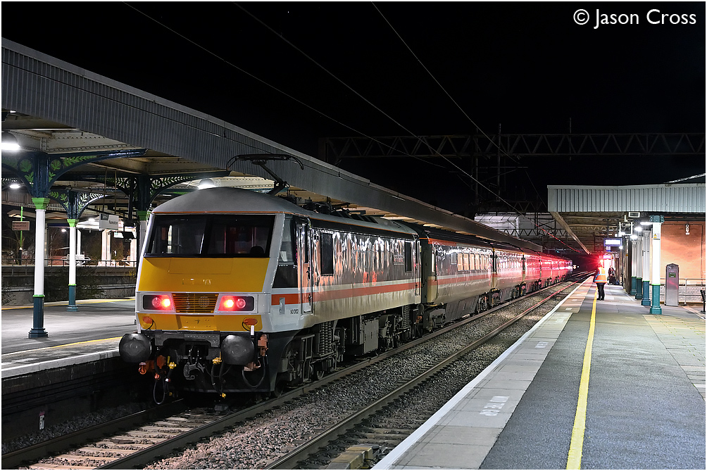 90002 pauses at Nuneaton on the rear of a 1Z92 1717 Carlisle to London Euston railtour. Date: 12 December 2020 Manipulation Notes: None