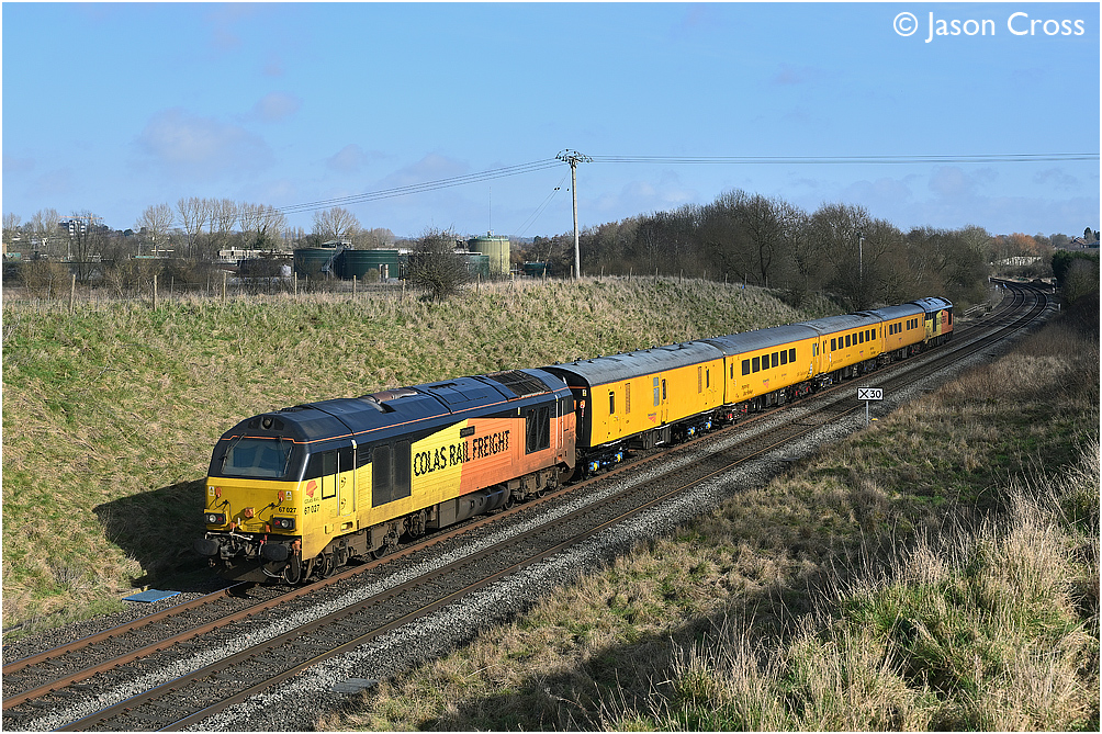 67027 on the rear of the 1Q51 Derby RTC to Eastleigh Works test train at Copley's Brook near Melton Mowbray. Date: 15 February 2021 Manipulation Notes: None