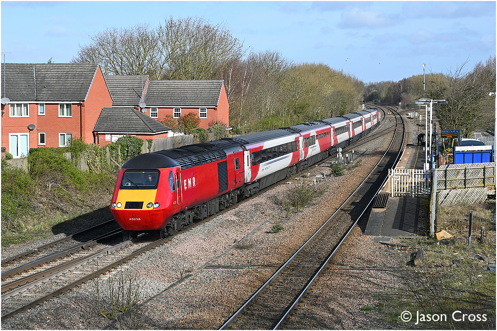 43238 races through Thurmaston at the head of the 1B23 0634 Leeds to St Pancras International. Date: 27 March 2021 Manipulation Notes: None