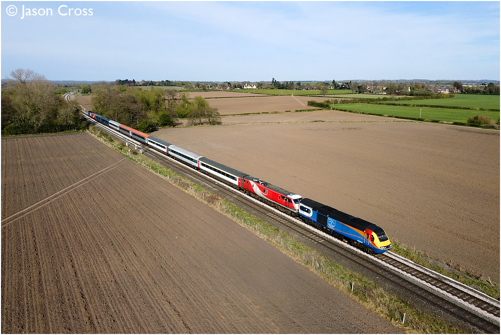 43054 and 91122 lead the DATS test train through East Goscote while working as 5Q55 Kettering to Rectory Siding. Date: 26 April 2021 Manipulation Notes: None Photo taken from a drone