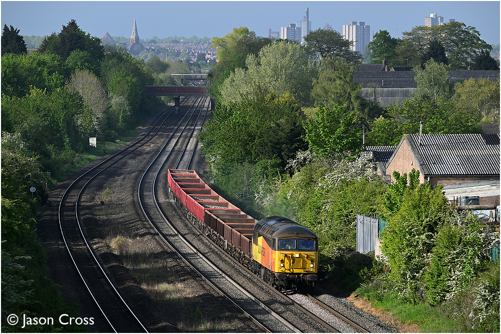 56113 powers away from Leicester with a 6C50 0800 Harrowden Junction to Toton North Yard engineering train. Date: 16 May 2021 Manipulation Notes: None