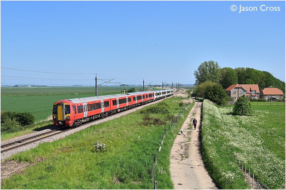 387203 and 387117 pass Black Horse Drove with the 1T21 0944 Kings Lynn to London Kings Cross. Date: 29 May 2021 Manipulation Notes: None Camera mounted on a tall pole and remotely fired